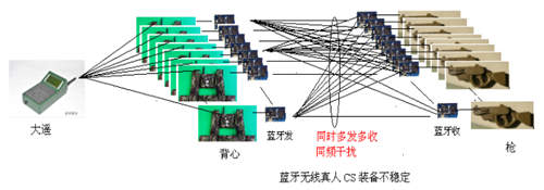 戰(zhàn)斗開始和戰(zhàn)斗結(jié)束命令由大遙發(fā)出,各背心收到后通過藍牙轉(zhuǎn)發(fā)給各激光發(fā)射器并啟動它。因為藍牙頻率相同,背心同時發(fā)送數(shù)據(jù),同頻干擾造成數(shù)據(jù)誤碼和傳輸不可靠,因此藍牙無線真人CS裝備不穩(wěn)定。